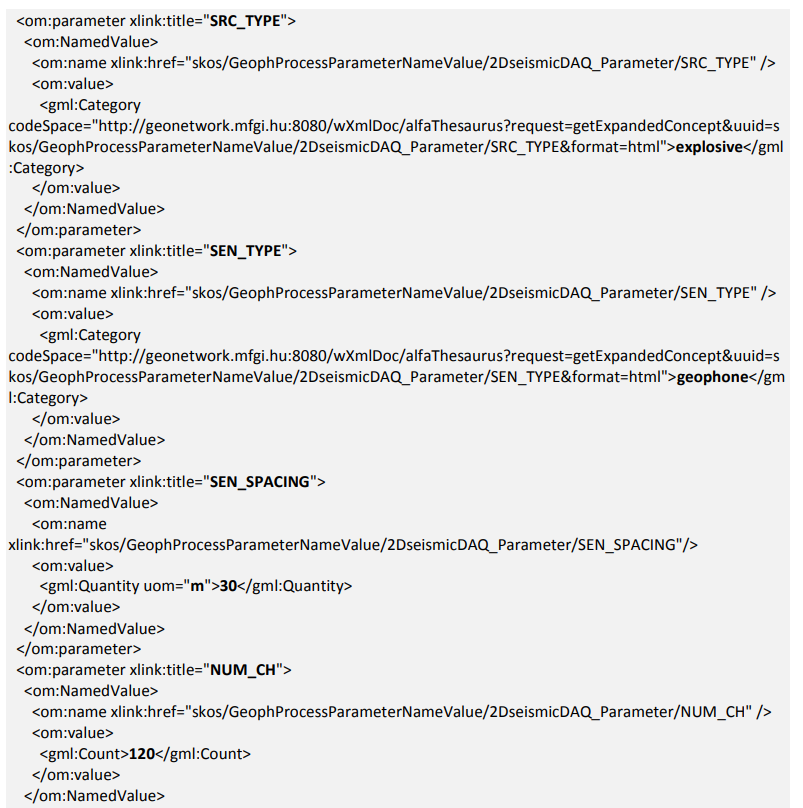 Ein datengenerierender Prozess (Process) entspricht z. B. der Erfassung von 2D-SeismikDaten. Geeignete processParameter wären in diesem Fall die Beprobungsrate (entspricht Eintrag SAMP_RATE der Codeliste), der Sensorabstand (entspricht SEN_SPACING), der Erfassungsbereich (entspricht CVRG) usw. Die Codeliste GeophProcessNameValue enthält Einträge, die zur Namensgebung von Prozessen (Attribut name von Process) vorgeschlagen werden, z. B. boreholeLogging oder 2DseismicProcessing; siehe INSPIREGEOLOGY (2013) ab Seite 312.