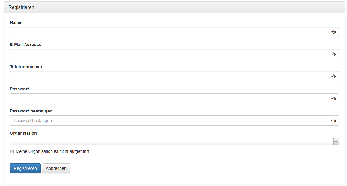 Meine Organisation ist nicht aufgeführt | Ist die Organisation des Benutzers nicht im System vorhanden, kann durch Setzen des Häkchens in diesem Feld eine neue Organisation registriert werden (siehe Kapitel 1.4.1 Neue Organisationen). |