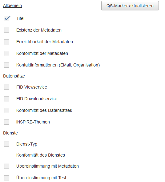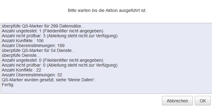 Im Ergebnis können nach Bestätigung des Fortschrittsdialoges zur Funktion "QS-Marker aktualisieren" im Bereich "Meine Daten", die Marker in der Spalte QS der Übersichtstabellen der Dienste und Datensätze eingesehen werden.