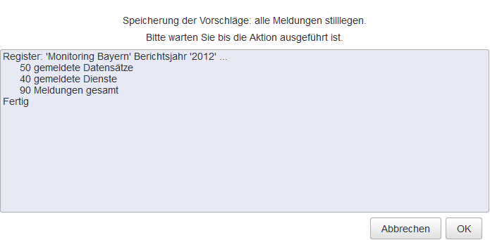 Das Ergebnis der Prüfung wird nach Bestätigung des vorangegangenen Fortschrittsdialoges, in der Proposalmarkierung des Datensatzes oder Dienstes gespeichert und in der gleichnamigen Spalte in der Tabelle unter "Meine Daten" angezeigt. Über "Vorschläge im Registry Bereich speichern" wird eine Proposal-Gruppe im Registry-Bereich angelegt und kann eingereicht werden. Hier schließt der normale Registrierungsprozess an. Mehrere Proposals gleichen Typs werden im Monitoring Client automatisch zu Gruppen zusammengestellt.