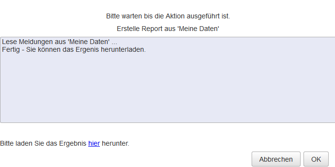 Das Ergebnis für die Funktion "Bericht "Meine Daten" erzeugen und herunterladen" wird als Downloadlink zu Verfügung gestellt. Analog verhält sich der Bericht zur "GDI-DE-Registry".