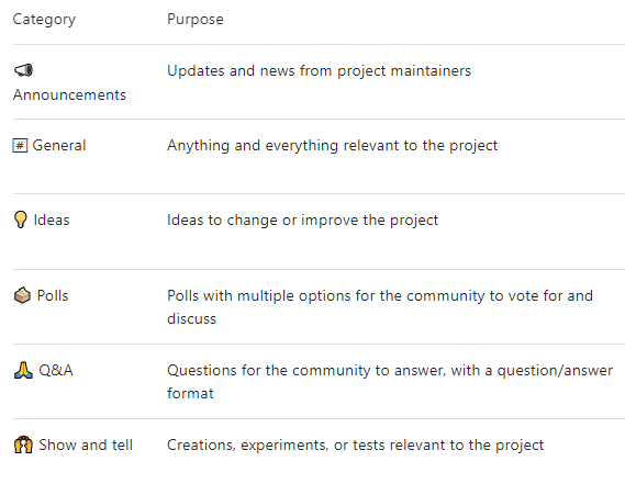 GitHub Discussions sind über den Tab Discussions erreichbar. Neue Beiträge können über den Button New discussion gestartet werden (nur für angemeldete GitHub-Nutzerinnen und -Nutzer verfügbar). Jeder Beitrag muss einer Kategorie zugewiesen werden. Aktuell werden die Standard-Kategorien genutzt: