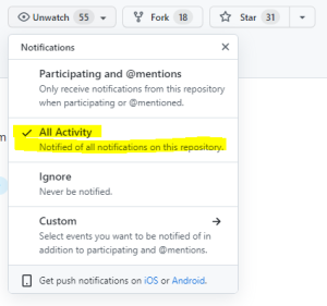 Die bisherigen Issues, die Ankündigungen, Verbesserungsvorschläge, Diskussionen und FAQs betreffen, werden sukzessive in GitHub Discussions verschoben. GitHub Discussions sind über den Tab Discussions erreichbar. Wichtige Ankündigungen (z. B. die Verfügbarkeit von neuen Features und Releases, wartungsbedingte Ausfälle der Komponenten) werden künftig über GitHub Discussions veröffentlicht. Um sich hierüber benachrichtigen zu lassen, muss in den Benachrichtigungs-Einstellungen des jeweiligen Repository die All Activity-Option ausgewählt werden bzw. bei Auswahl der Custom-Option der Haken bei Discussions gesetzt werden.