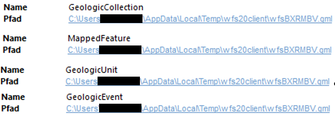 - I. d. R. ist bereits der TopLevel-FeatureType vorausgewählt (im Beispiel „ge:GeologicCollection“). Wenn dieses geladen wird, werden, wegen der Einstellungen in der Konfiguration, auch die darunterliegenden FeatureTypes geladen (vgl. Screenshot weiter unten)
