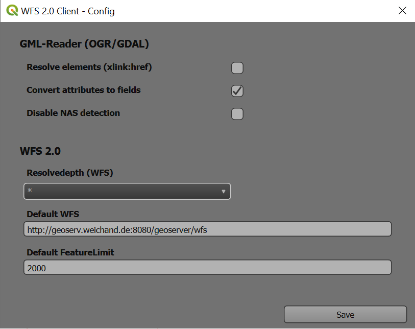 - im Abschnitt „WFS 2.0“ bei „Resolvedepth (WFS)“ „*“ auswählen. Manchmal erzielt man jedoch mit „Resolvedepth (WFS)“ „ “ bessere Ergebnisse.