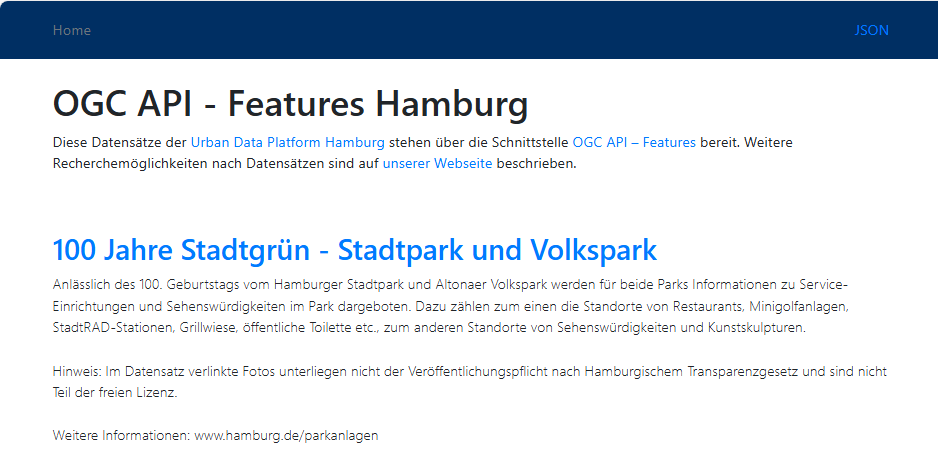 Für die Urban Data Platform Hamburg findet sich die Einstiegsseite dieser API unter https://api.hamburg.de/datasets/v1. Dort sind die über die API verfügbaren Datensätze aufgelistet.